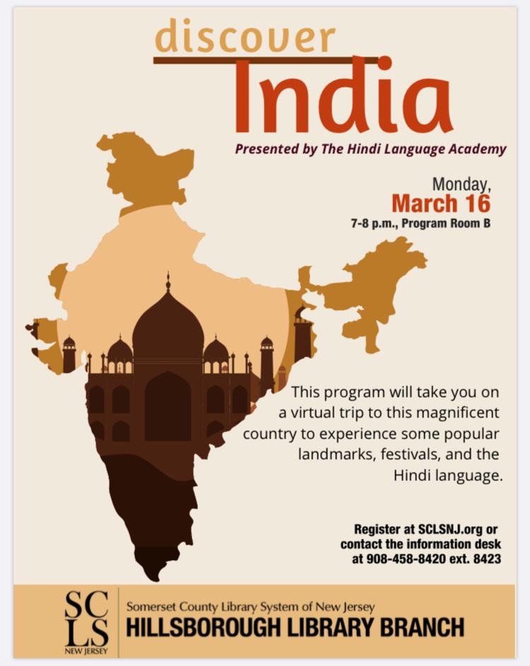 India has been a country of diverse culture and different dimensions. It attracts people from all over the world due to different reasons. Witness some of those reasons and have a glimpse of this magnificent culture in this Hillsborough library sponsored program on March 16th 2020 between 7.00 to 8.00 pm.