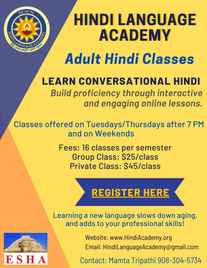 Presenting: Proficiency-focused and result-oriented Hindi Classes for Adult Learners. If interested, fill the registration form, pay only when a batch is assigned. Prior knowledge of Hindi is not required. Learners can opt for weekly group classes or self-paced private classes. Contact for information on curriculum, syllabus and more.