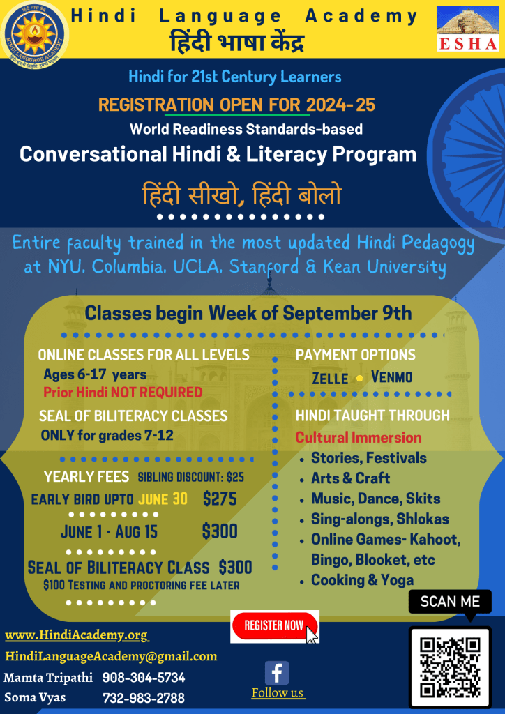 With that as our working philosophy and the reason behind our roaring success, Hindi Language Academy (HLA) is now accepting enrollments from our returning and new students. Please read the flyer carefully as there is information about session beginning dates, Seal of Biliteracy in Hindi classes, early bird and sibling discounts. Together let’s give our younger generations the gift of connecting with their roots and empowering them for college and career readiness with our World Readiness Standards-based curriculum. All this!!! – from the comfort of your home.